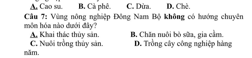 `-` Vùng nông nghiệp Đông Nam Bộ không có hướng chuyên môn hóa nào dưới đây `?`
