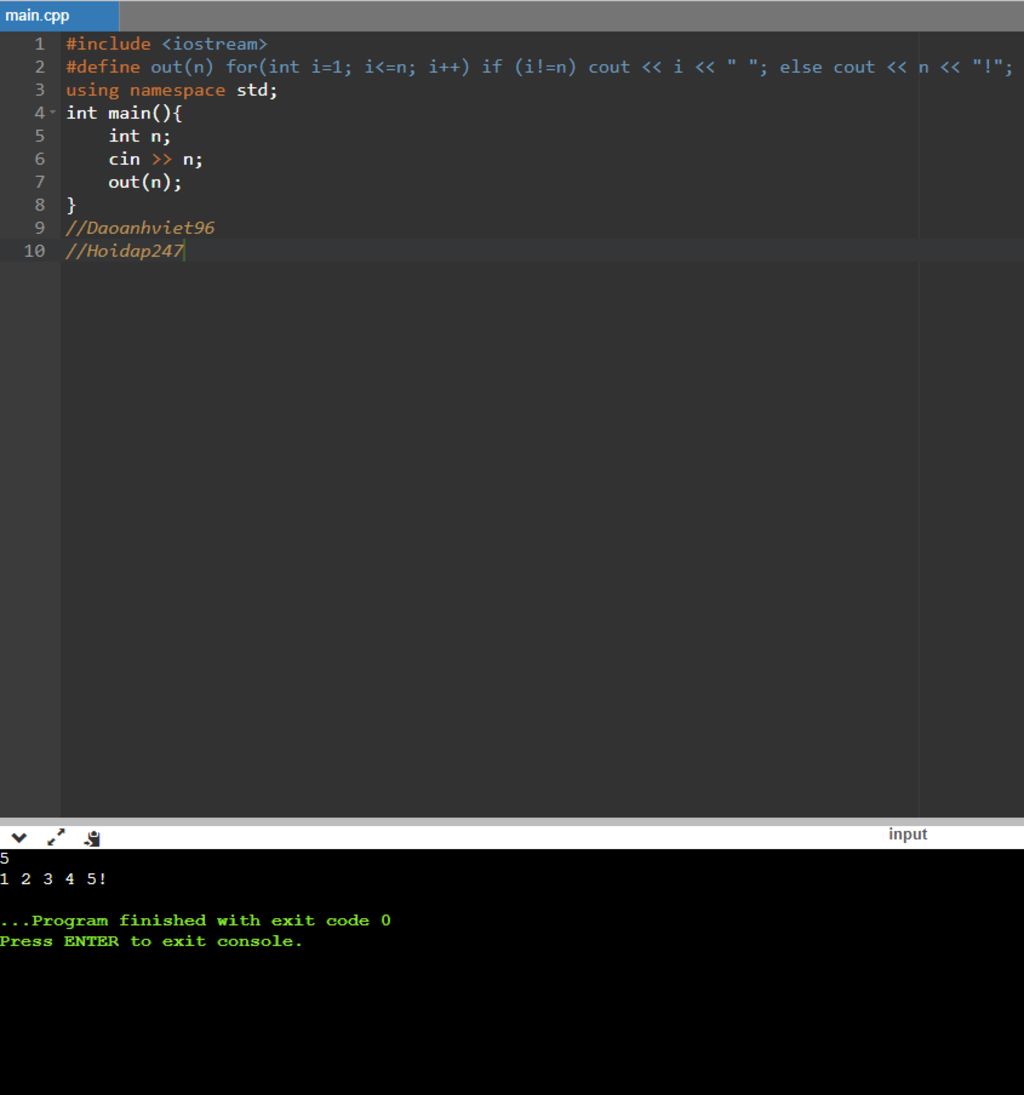 #define out(n) for(int i=1; i<=n; i++) if (i!=n) cout << i << " "; else cout << n << "!";