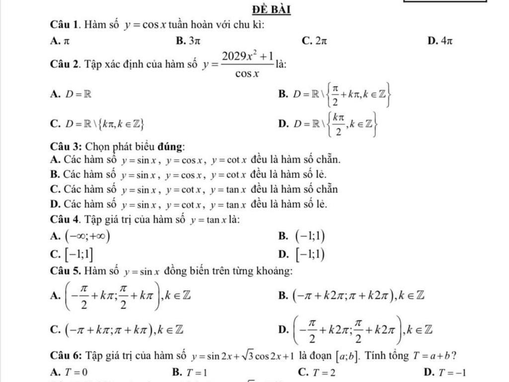 Câu 1. Hàm số y=cos x tuần hoàn với chu kì: