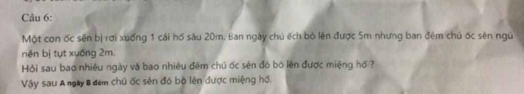 Đến ngày thứ 6, ban ngày nó bò lên 5m thì nó đã bò lên được miệng hố mà không cần đợi đến ban đêm để bị tụt xuống.