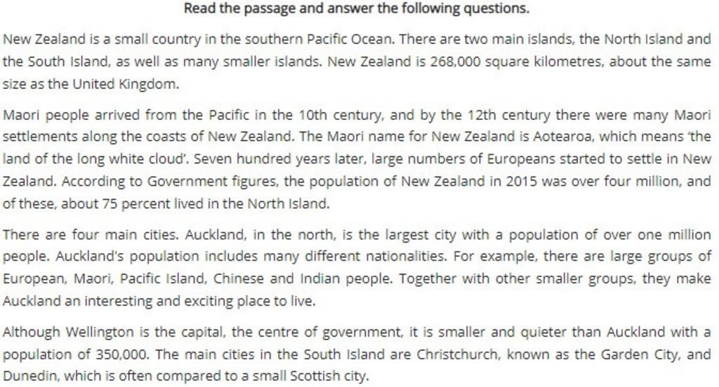 Dịch: Theo số liệu của chính phủ, dân số ở New Zealand vào năm 2015 đã vượt mức 4 triệu người, và trong số này, khoảng 75% lượng người đã sống ở đảo phía Bắc.