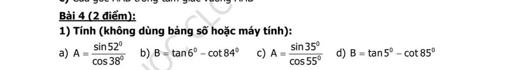 $a) A=\dfrac{\sin 52^\circ}{\cos 38^\circ}\\ =\dfrac{\cos(90^\circ- 52^\circ)}{\cos 38^\circ}\\ =\dfrac{\cos 38^\circ}{\cos 38^\circ}\\ =1\\ b) B=\tan 6^\circ-\cot 84^\circ\\ =\cot (90^\circ- 6^\circ)-\cot 84^\circ\\ =\cot 84^\circ-\cot 84^\circ\\ =0\\ c) A=\dfrac{\sin 55^\circ}{\cos 35^\circ}\\ =\dfrac{\cos(90^\circ- 55^\circ)}{\cos 35^\circ}\\ =\dfrac{\cos 35^\circ}{\cos 35^\circ}\\ =1\\ d) B=\tan 5^\circ-\cot 85^\circ\\ =\cot (90^\circ- 5^\circ)-\cot 85^\circ\\ =\cot 85^\circ-\cot 85^\circ\\ =0.$