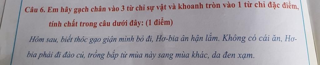 Câu 6. Em hãy gạch chân vào 3 từ chỉ sự vật và khoanh tròn vào 1 từ chỉ đặc điểm,