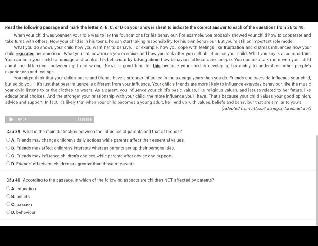 `-` Dẫn chứng : Friends and peers do influence your child, but so do you - it's just that peer influence is different from your influence. Your child's friends are more likely to influence everyday behaviour, like the music your child listens to or the clothes he wears.