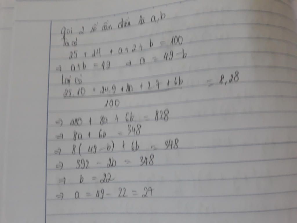 điểm số trung bình là 8,28⇒$\frac{10.25+9.24+7.2+8x+6y}{100}$=$\frac{250+216+14+8x+6y}{100}$=$\frac{480+8x+6y}{100}$=8,28(1)