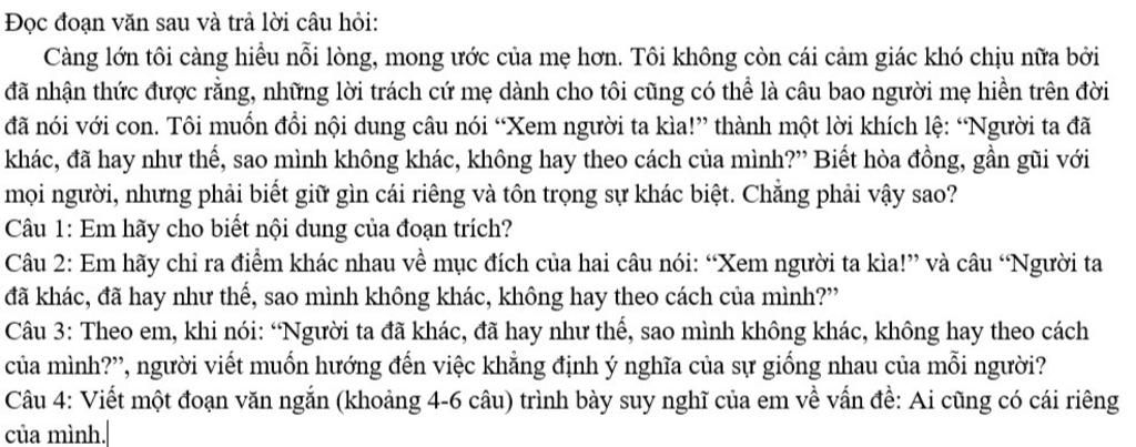 Càng lớn tôi càng hiểu nỗi lòng, mong ước của mẹ hơn. Tôi không còn cái cảm giác khó chịu nữa bởi đã nhận thức được rằng, những lời trách cứ mẹ dành cho tôi cũng có thể là câu bao người mẹ hiền trên đời đã nói với con. Tôi muốn đổi nội dung câu nói “Xem người ta kìa!” thành một lời khích lệ: “Người ta đã khác, đã hay như thế, sao mình không khác, không hay theo cách của mình?” Biết hòa đồng, gần gũi với mọi người, nhưng phải biết giữ gìn cái riêng và tôn trọng sự khác biệt. Chẳng phải vậy sao?