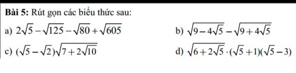 `a) 2\sqrt{5} - \sqrt{125} - \sqrt{80} + \sqrt{605}`