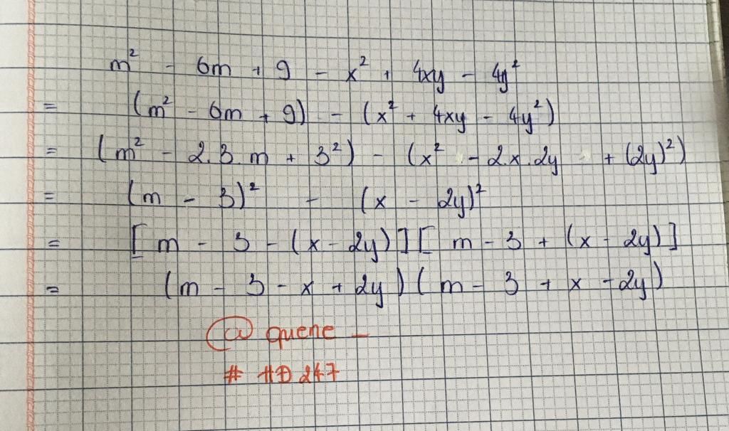 ` = (m^2 - 6m + 9) - (x^2 - 4xy + 4y^2)`
