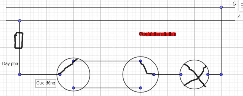 `->` Khi nối sơ đồ mạch điện 2 công tắc 3 cực điều khiển 1 đèn, cầu chì sẽ mắc nối tiếp vào dây pha và nối đến cực động của công tắc 3 cực (Như hình dưới)