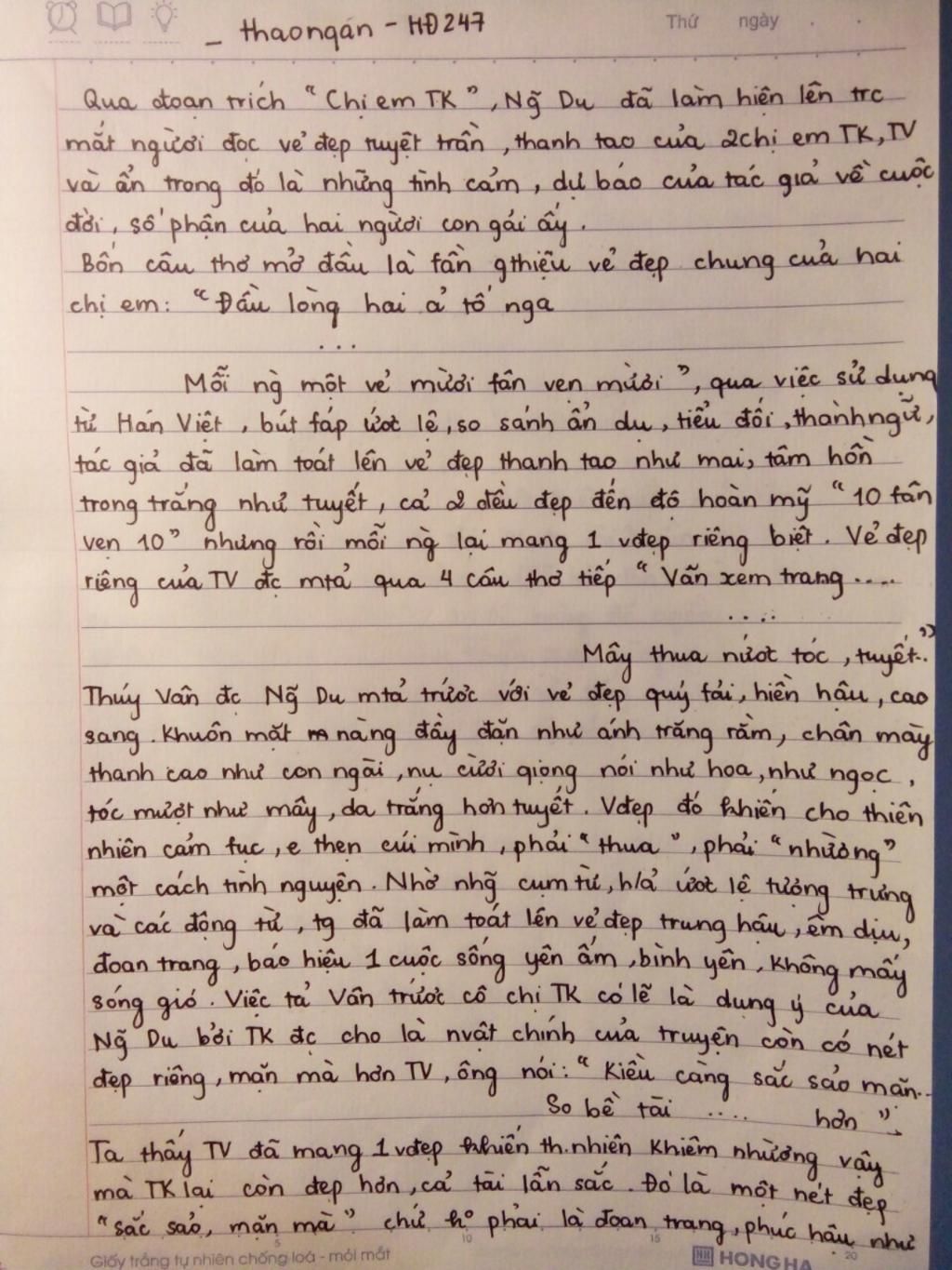 Tóm lại, Thúy Kiều là một nhân vật tuyệt đẹp trong Đoạn trường tân thanh. Thi hào Nguyễn Du với cảm hứng nhân đao và tài nghệ thơ ca trác việt đã miêu tả Thúy Kiều bằng những vần thơ lục bát đẹp đến nhuần nhị, thấu cảm lòng người. Ông đã dành cho nhân vật bao tình cảm yêu mến, trân trọng sâu sắc. Sự kết hợp tài tình bút pháp ước lệ, tượng trưng, sử dụng sáng tạo các biện pháp tu từ, nhất là phép ẩn dụ, so sánh, lớp ngôn ngữ thơ tinh luyện, hàm súc, hình tượng gợi cảm, tài năng miêu tả người xuất chúng vẽ nên bức chân dung của bậc tuyệt thế giai nhân bằng thơ sáng giá nhất trong nền văn học cô nước nhà. Xưa nay, chưa từng có người đẹp như thế.