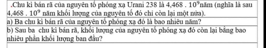 Ta có: Sau `4,468.10^9` năm khối lượng của nguyên tố đó chỉ còn lại một nửa khối lượng ban đầu
