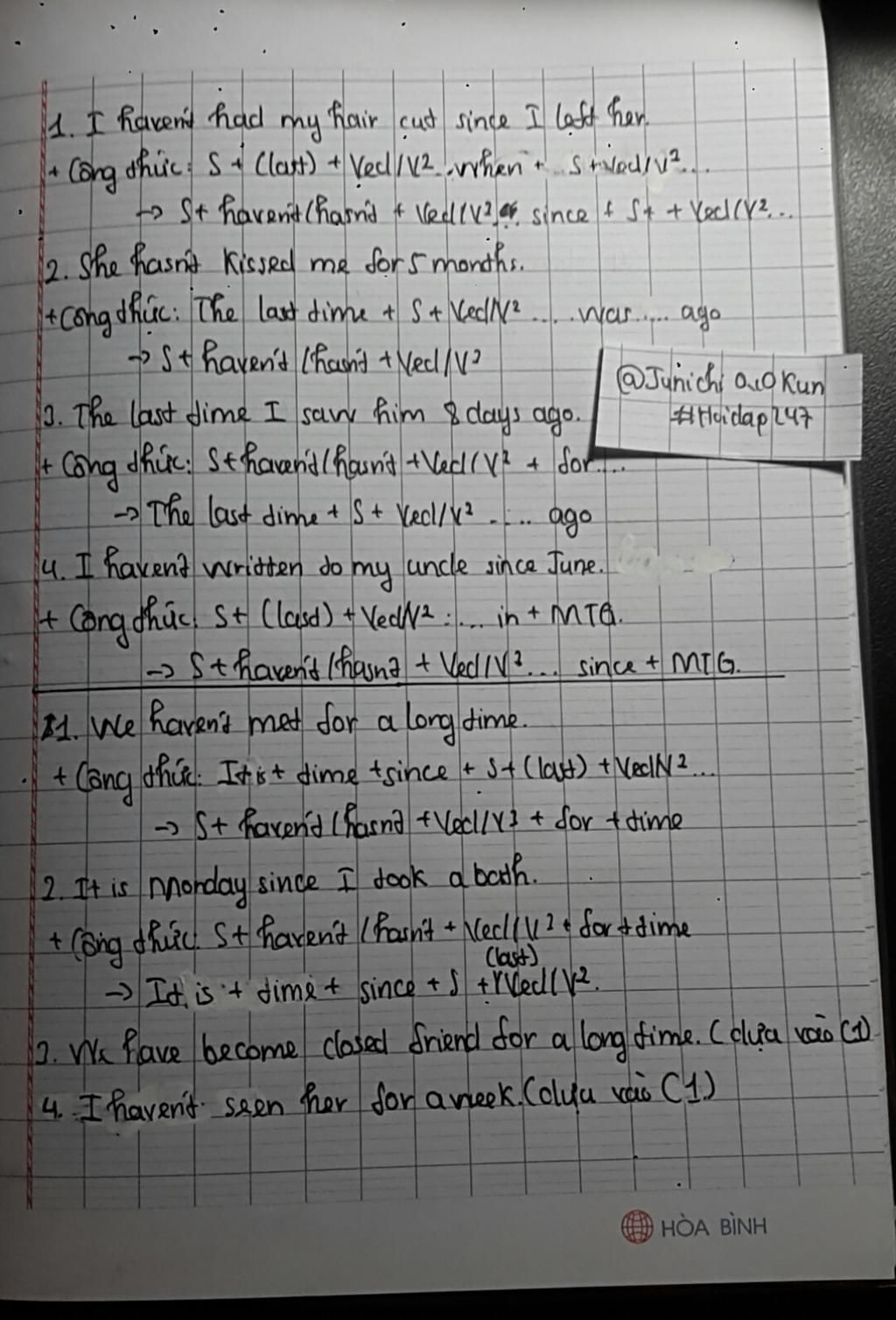 `-` Cấu trúc: It's + time + since + S (last) + V2/ed