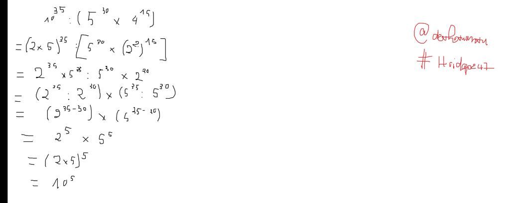 `= (2 × 5)^{35} : [5^{30} × (2^{2})^{15}]`