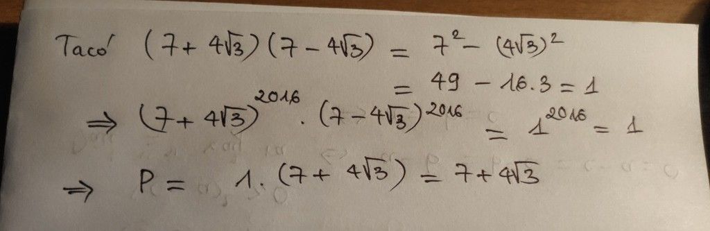Ta có: $P=\left({7+4\sqrt3}\right)^{2017}\left({7-4\sqrt3}\right)^{2016}$