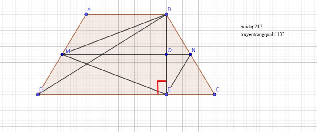 Do đó: `MO` là đường trung bình của hình thang `ABDE` (đường thẳng đi qua trung điểm của một cạnh bên hình thang và song song với hai đáy thì đi qua trung điểm của cạnh thứ hai)