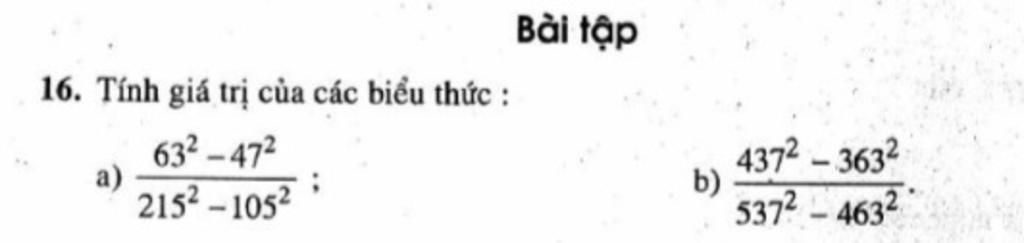 `a)(63^2-47^2)/(215^2-105^2)=((63-47)(63+47))/((215-105)(215+105))=(16.110)/(110.320)=16/320=16/(16.20)=1/20`