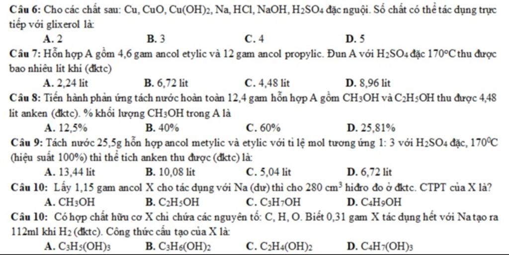 Câu 7: Hỗn hợp A gồm 4,6 gam ancol etylic và 12 gam ancol propylic. Đun A với H2SO4 đặc 170°C thu được