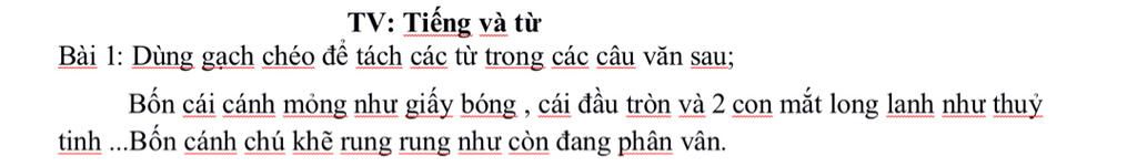 Bốn / cánh / mỏng / như / giấy bóng, / cái/ đầu / tròn / và / 2 / con mắt / long lanh / như / thủy tinh / .. Bốn / cánh / chú / khẽ / rung rung / như / đang/ còn/ phân vân