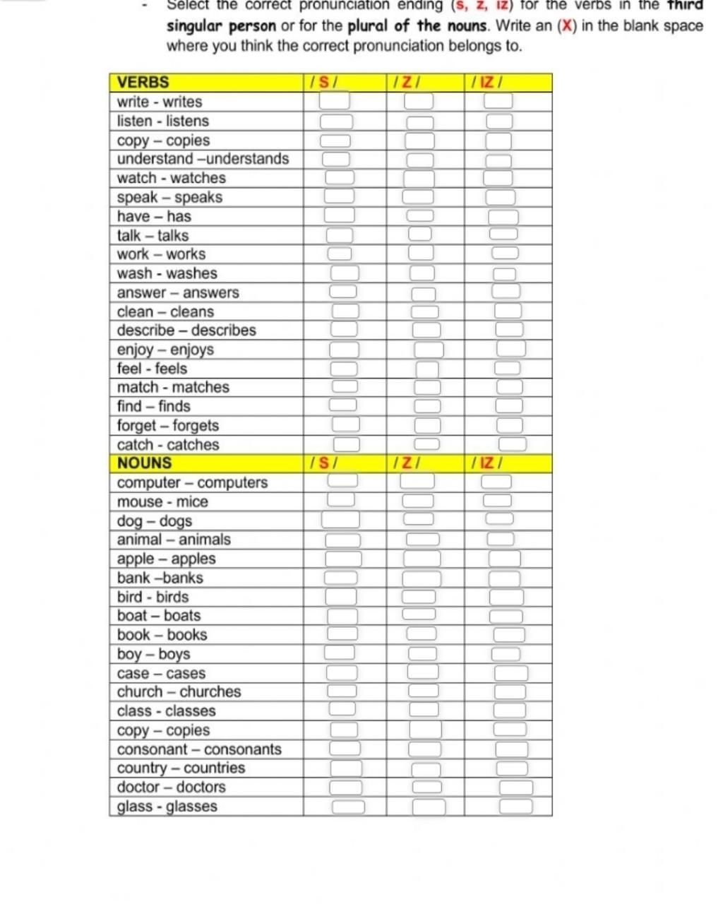 singular person or for the plural of the nouns. Write an (X) in the blank space