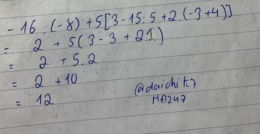 ` -16 : (-8) + 5 xx [3 - 15 : 5 + 2 xx (-3 + 4)] `
