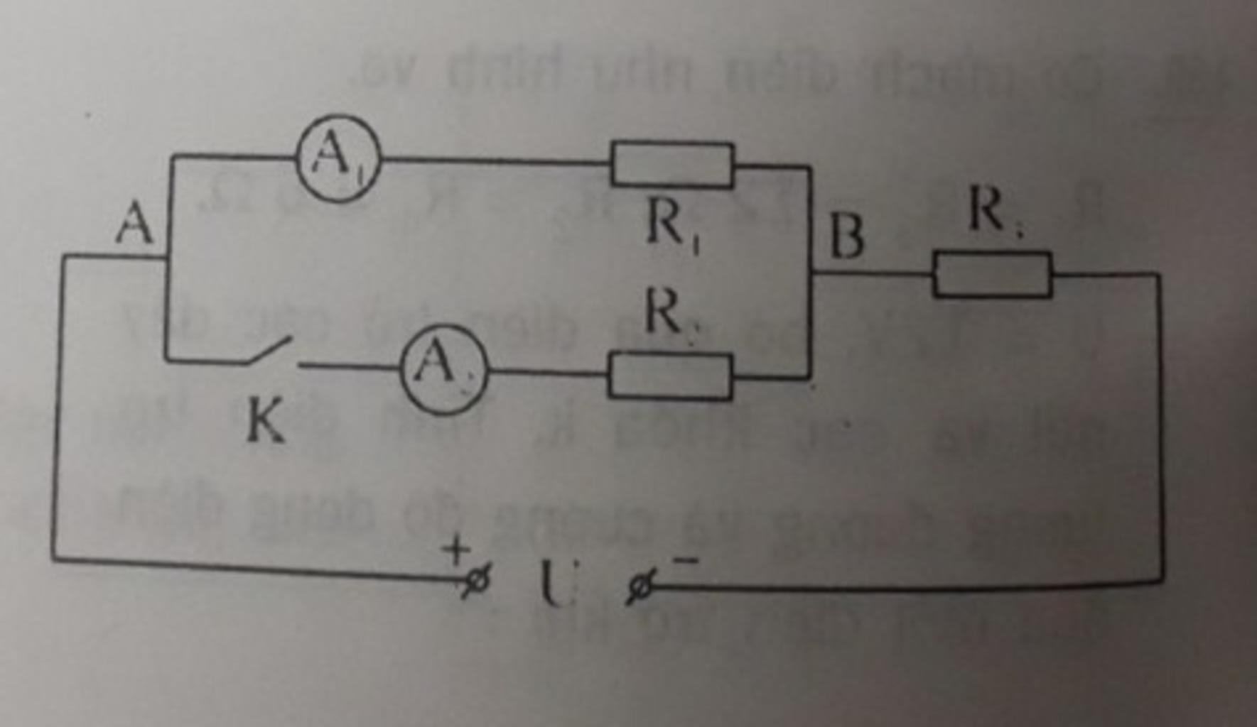 $\\$ $\bullet$ Khi `K` mở, dòng điện không chạy qua ampe kế `A2`, sơ đồ mạch điện lúc này là : `R_1` nối tiếp `R_3`