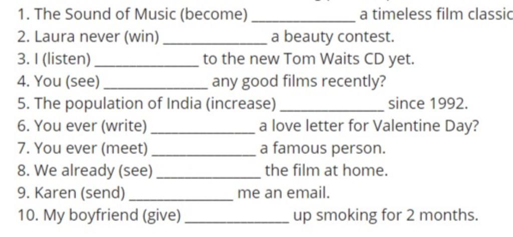 - Dựa vào ngữ cảnh (việc Laura chưa thứng cuộc thi sắc đẹp xảy ra trong qk và vẫn diễn ra tại thời điểm nói) => HTHT: Have/has PII
