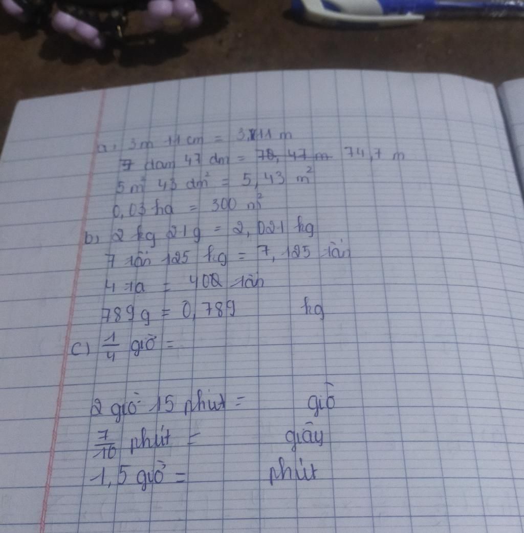 `2` giờ `15` phút `= 2` giờ `+ ( 15 : 60 )` giờ `= 2` giờ `+ 0,25` giờ `= 2,25` giờ