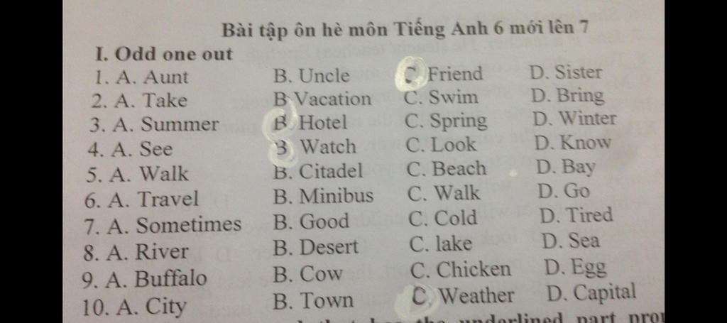 `2)` B chỉ danh từ: kì nghỉ , những cái khác là động từ : A. lấy; C. bơi, D. mang
