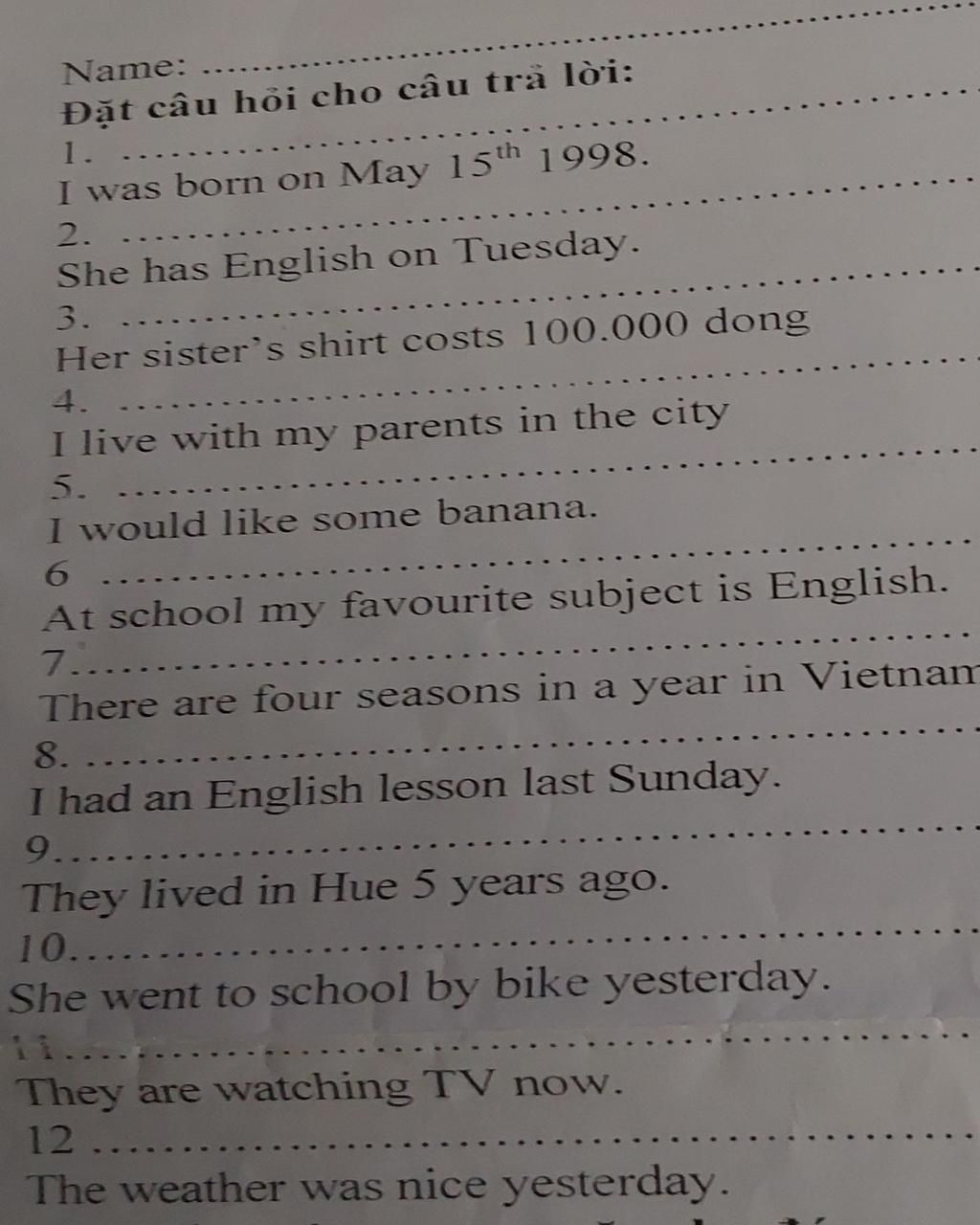 `\rightarrow` Thì QKĐ ( ĐT Tobe - NV ) : Was / Were + S + adj / n ? ( `1 , 12` )