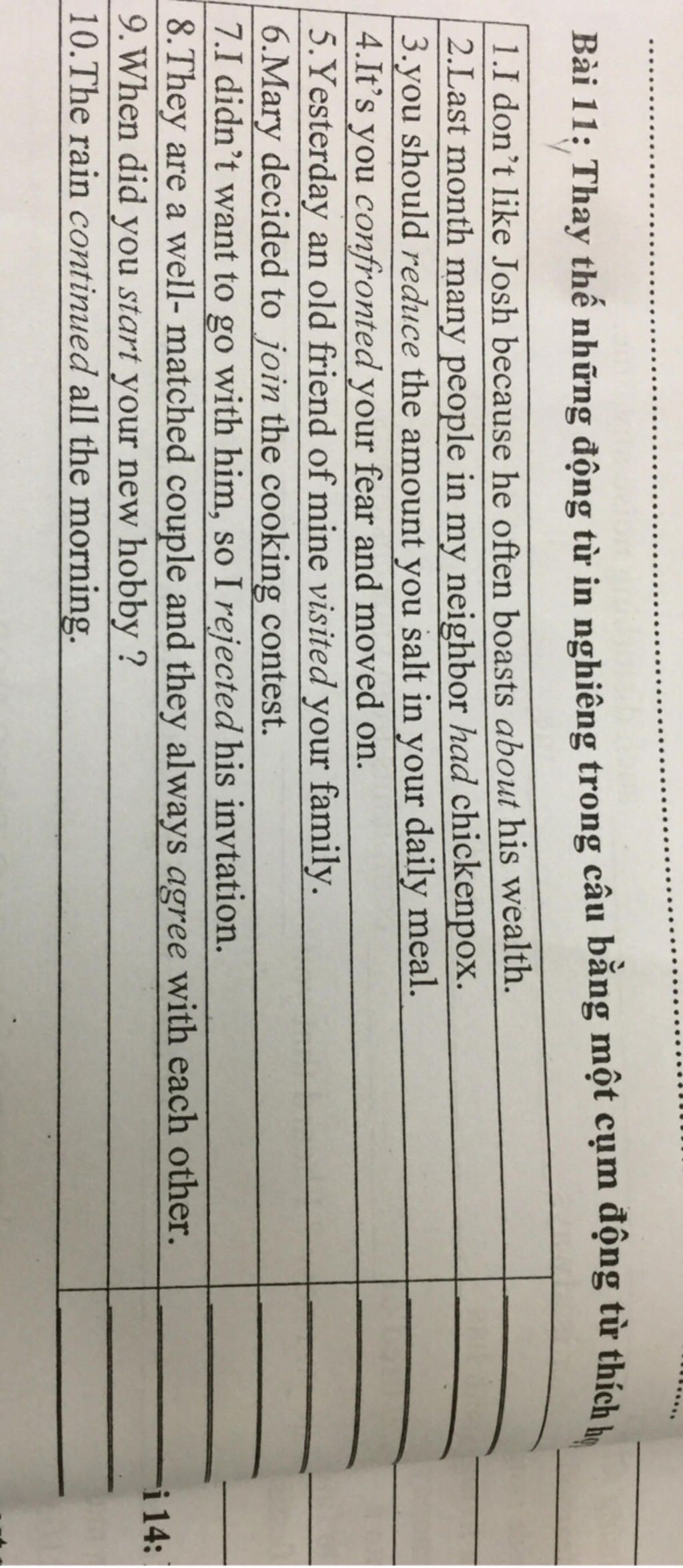 Bài 11: Thay thế những động từ in nghiêng trong câu bằng một cụm động từ thích h