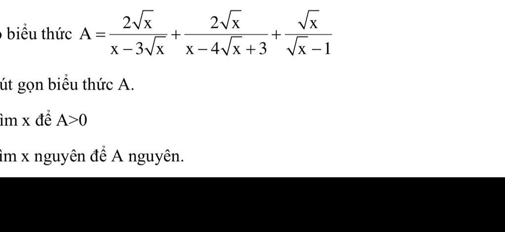 `A=(2\sqrt{x})/(x-3\sqrt{x})+(2\sqrt{x})/(x-4\sqrt{x}+3)+\sqrt{x}/(\sqrt{x}-1)` với `x>=0;x` `ne` `1` `;` `x ne 9`