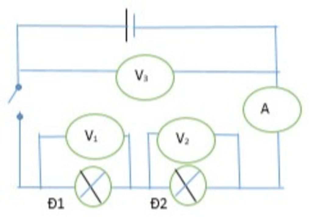 Do mạch điện gồm hai bóng đèn mắc nối tiếp nên hiệu điện thế hai đầu mạch điện bằng tổng hiệu điện thế hai đầu hai bóng đèn `Đ_1,Đ_2`: