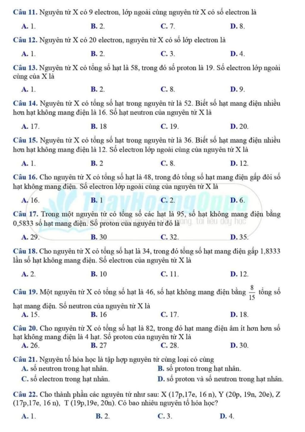 Câu 11. Nguyên tử X có 9 electron, lớp ngoài cùng nguyên tử X có số electron là