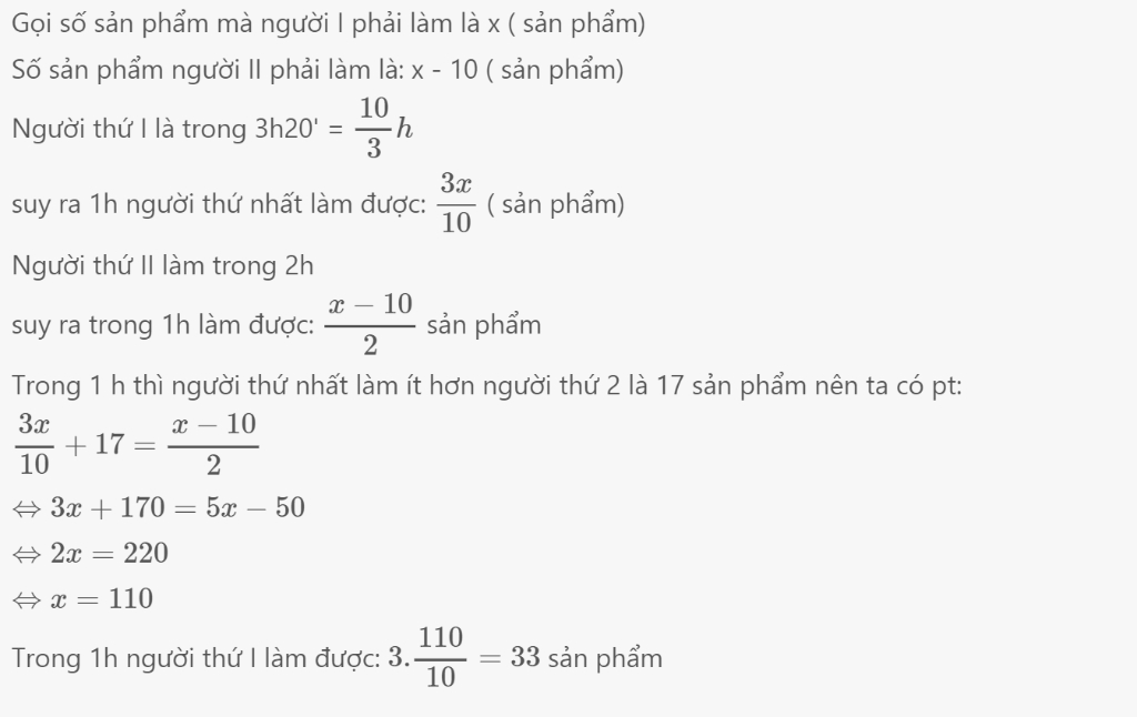 Hai công nhân được giao làm một số sản phẩm, người thứ nhất phải làm ít hơn người thứ hai 10 sản phẩm. Người thứ nhất làm trong 3 giờ 20 phút , người thứ hai làm trong 2 giờ, biết rằng mỗi giờ người thứ nhất làm ít hơn người thứ hai là 17 sản phẩm . Tính số sản phẩm người thứ nhất làm được trong một giờ?