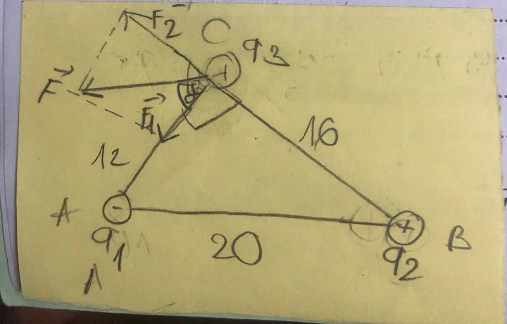 $ F_1 = \dfrac{k.|q_1.q_3|}{AC^2} = \dfrac{9.10^9.|-3.10^{-8}.2.10^{-6}|}{0,12^2} = 0,0375 N $