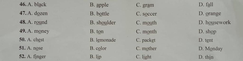 Câu 51 chọn A ( từ này phát âm là əʊ còn các đáp án còn lại đều phát âm là ʌ )