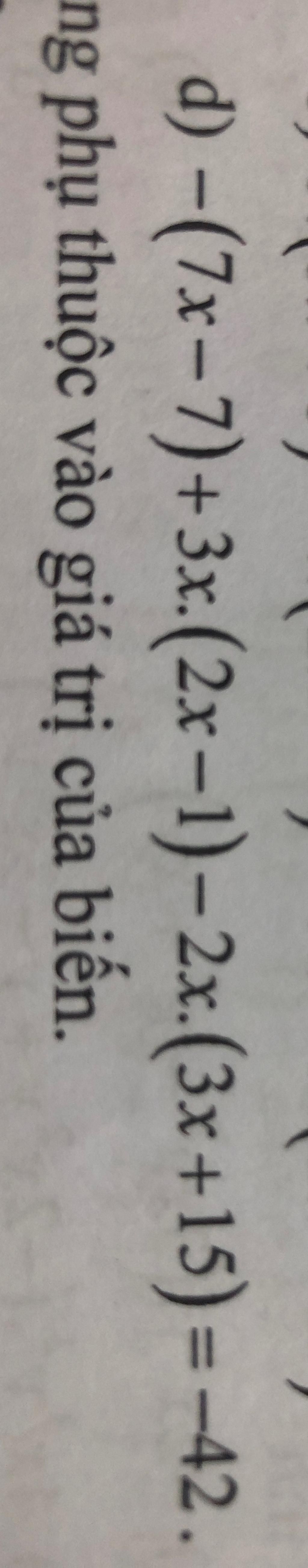 `d,-(7x-7)+3x(2x-1)-2x(3x+15)=-42`