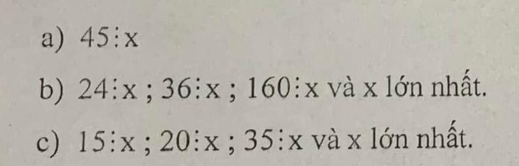 Vì `24` : x , `36` : x , `160` : x nên `( 24;36;160)`