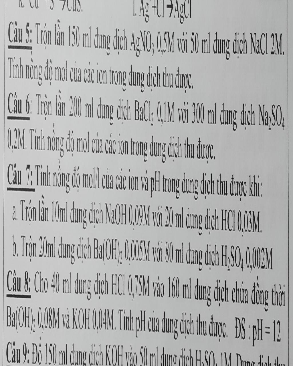 Ta có: $\begin{cases} n_{Ba^{2+}}=0,02×0,005=10^{-4}(mol)\\n_{OH^-}=2.10^{-4}(mol)\\n_{SO_4^{2-}}=0,08×0,002=1,6.10^{-4}(mol)\\n_{H^+}=3,2.10^{-4}(mol) \end{cases}$