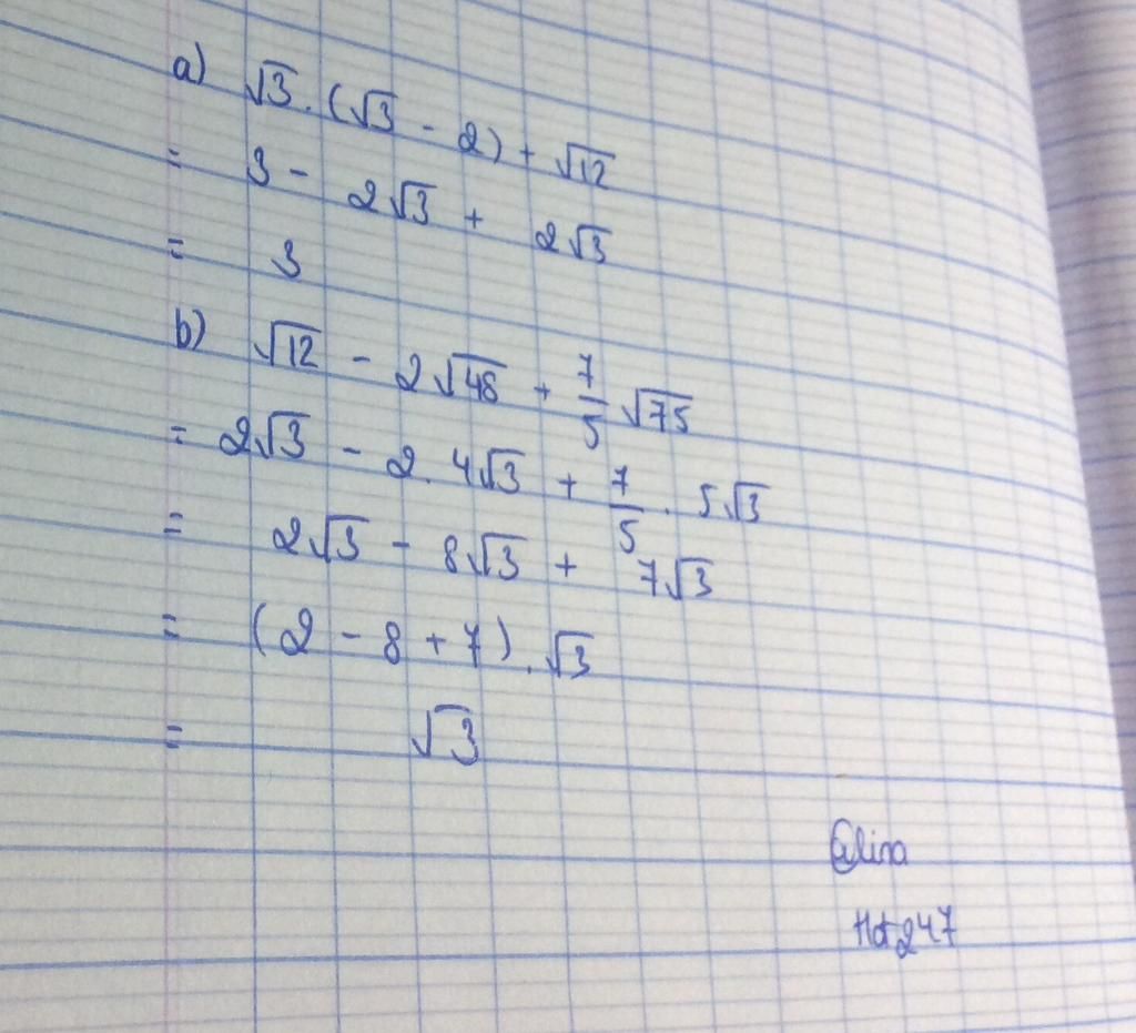 a) $\sqrt{3}$ x ($\sqrt{3}$ - 2) + $\sqrt{12}$