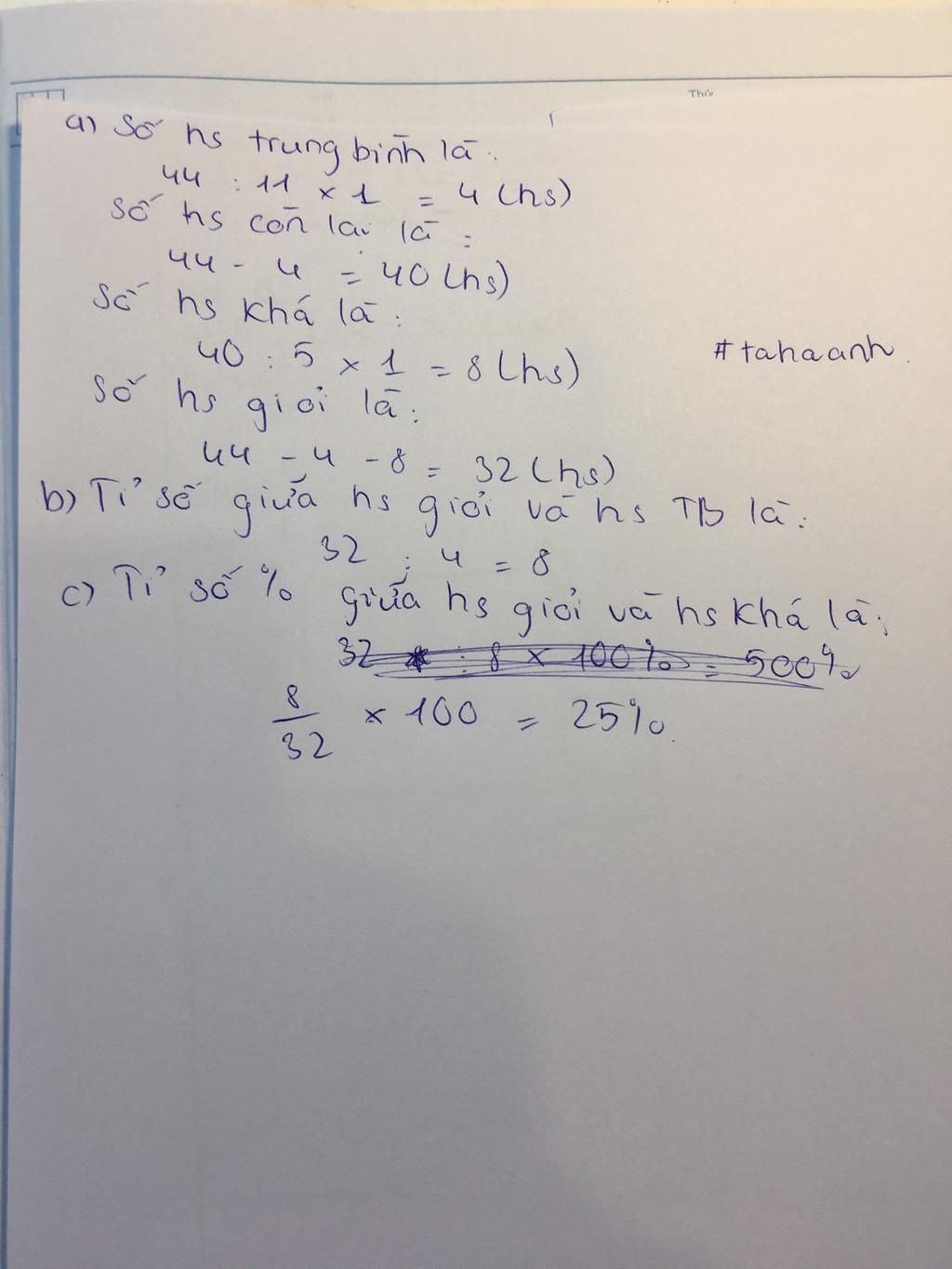 b) Tỉ số giữa học sinh giỏi và hs trung bình là: 32:4 = 8