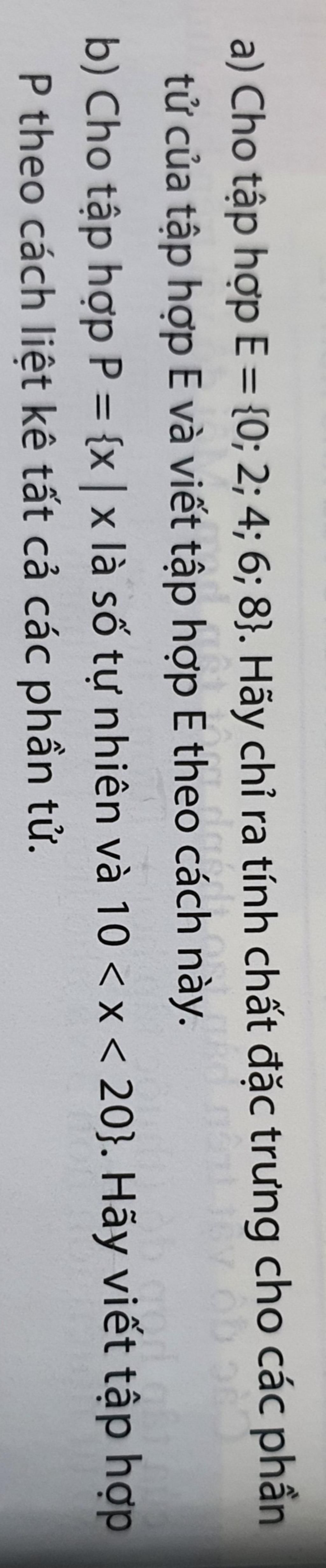 a) Cho tập hợp E= {0; 2; 4; 6; 8}. Hãy chỉ ra tính chất đặc trưng