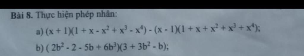 `b)` `(2b^2-2-5b+6b^3)(3+3b^2-b)`