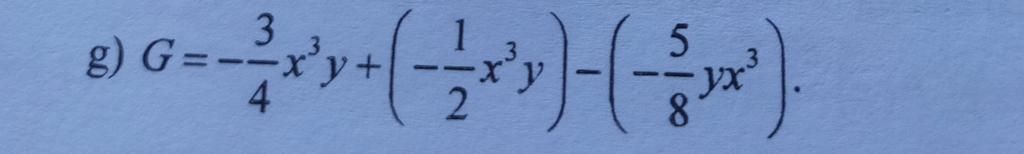 `g)` `G=-3/4 x^3y+(-1/2 x^3y) - (-5/8 yx^3)`