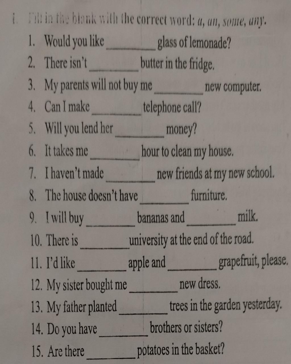 $-$ Any: Cũng mang nghĩa "một chút, một vài" và cả "bất cứ.., không chút nào"; đứng trước cả danh từ đếm được/không đếm được; nhưng chỉ được dùng trong câu phủ định và nghi vấn (câu hỏi). $(d)$