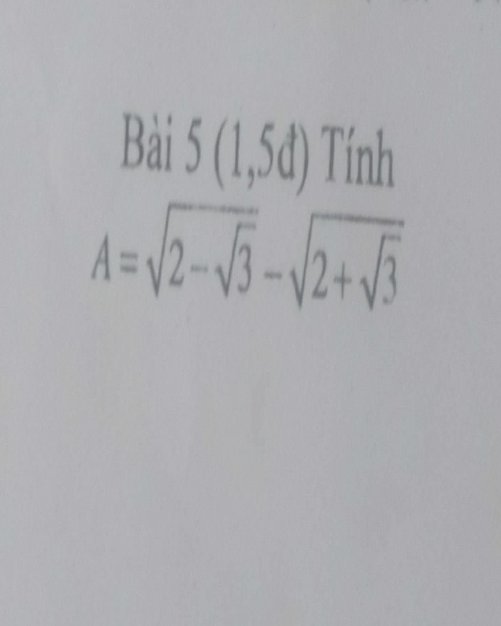 $A=\sqrt{2-\sqrt{3}}-\sqrt{2+\sqrt{3}}\\=\sqrt{\dfrac{4-2\sqrt{3}}{2}}-\sqrt{\dfrac{4+2\sqrt{3}}{2}}\\=\dfrac{\sqrt{4-2\sqrt{3}}}{\sqrt{2}}-\dfrac{\sqrt{4+2\sqrt{3}}}{\sqrt{2}}\\=\dfrac{\sqrt{(\sqrt{3}-1)^2}-\sqrt{(\sqrt{3}+1)^2}}{\sqrt{2}}\\=\dfrac{\sqrt{3}-1-\sqrt{3}-1}{\sqrt{2}}\\=\dfrac{-2}{\sqrt{2}}\\=-\sqrt{2}$