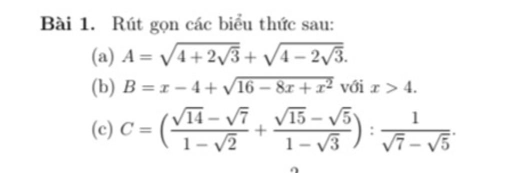 `c)` `C=((\sqrt{14}-\sqrt{7})/(1-\sqrt{2})+(\sqrt{15}-\sqrt{5})/(1-\sqrt{3})):1/(\sqrt{7}-\sqrt{5})`