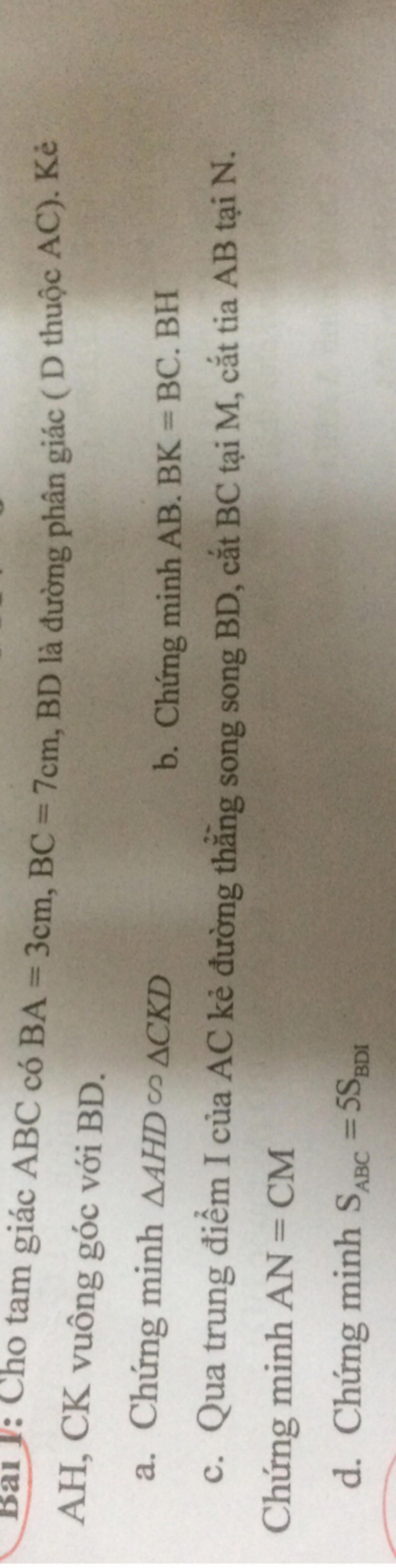 Bai I: Cho tam giác ABC có BA = 3cm, BC = 7cm, BD là đường phân giác ( D thuộc AC). Ke