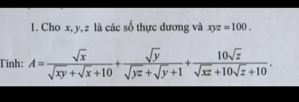 $A=\dfrac{\sqrt{xz}}{\sqrt{xyz}+\sqrt{xz}+10\sqrt{z}}+\dfrac{\sqrt{xyz}}{\sqrt{xy{{z}^{2}}}+\sqrt{xyz}+\sqrt{xz}}+\dfrac{10\sqrt{z}}{\sqrt{xz}+10\sqrt{z}+10}$
