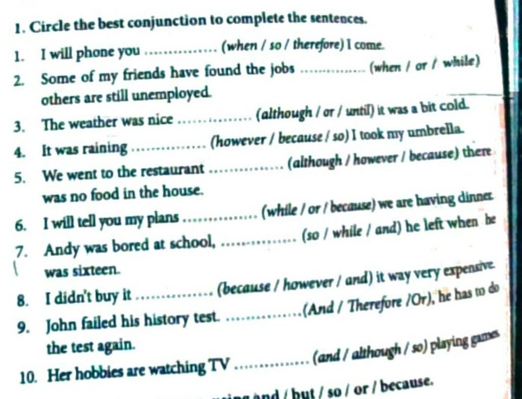 1. Circle the best conjunction to complete the sentences.